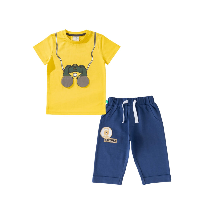 Baby Boys Explorer T-Shirt & Pants Set – Adventure Binocular Print (Yellow & Navy Blue)