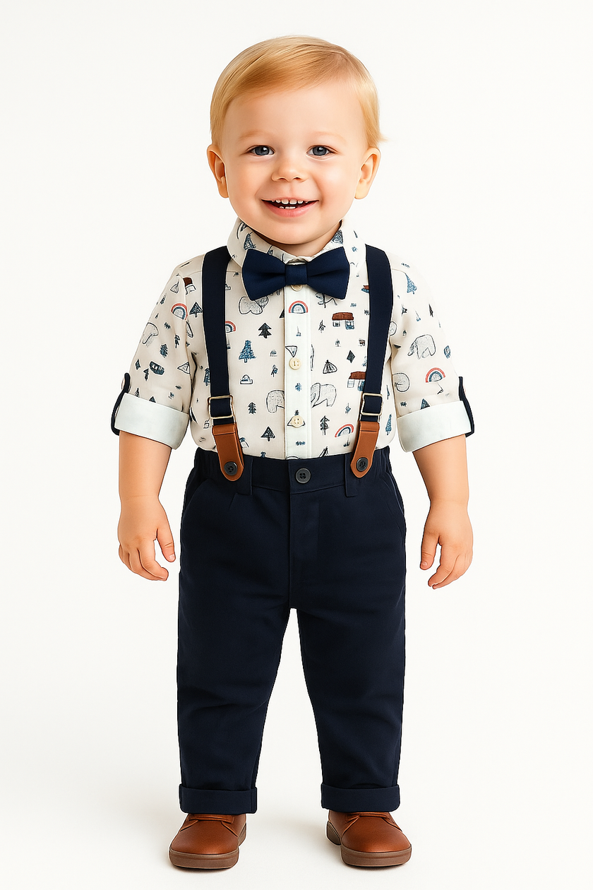 Baby Boys' Formal Outfit – Printed Shirt with Suspenders & Navy Pants