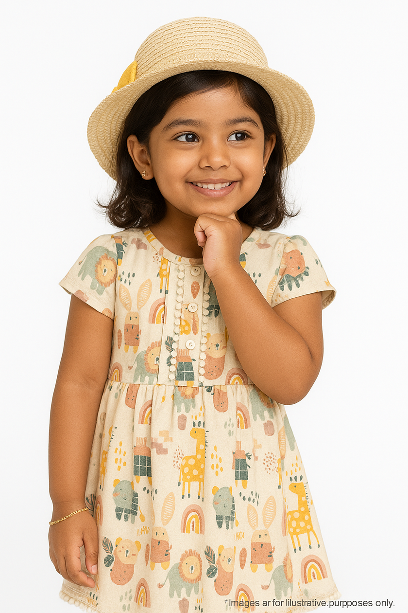 "Baby Girls' Animal Print Cotton Half Sleeve Dress with Pom-Pom Hem – Off-white"