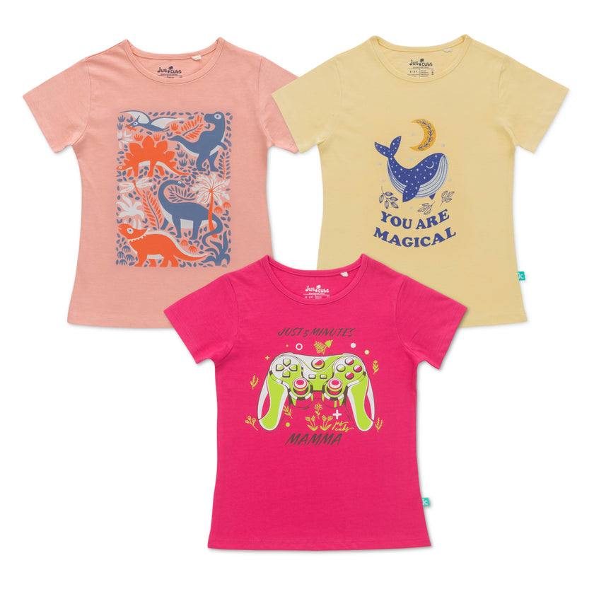 "Girls' Cotton Printed T-Shirt Set – Pack of 3 Colorful Tees with Fun Graphics"