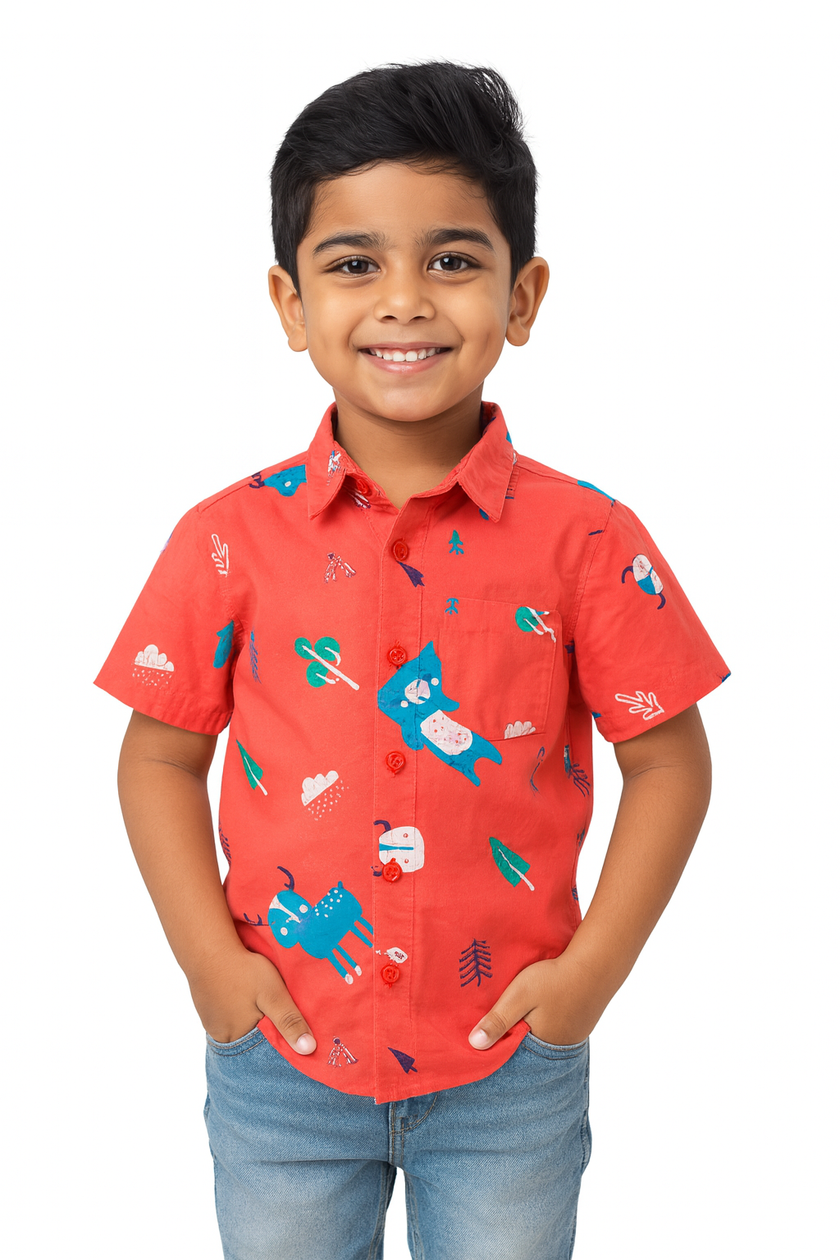 Boys' Coral Red Short Sleeve Button-Up Shirt with Forest Animal Print