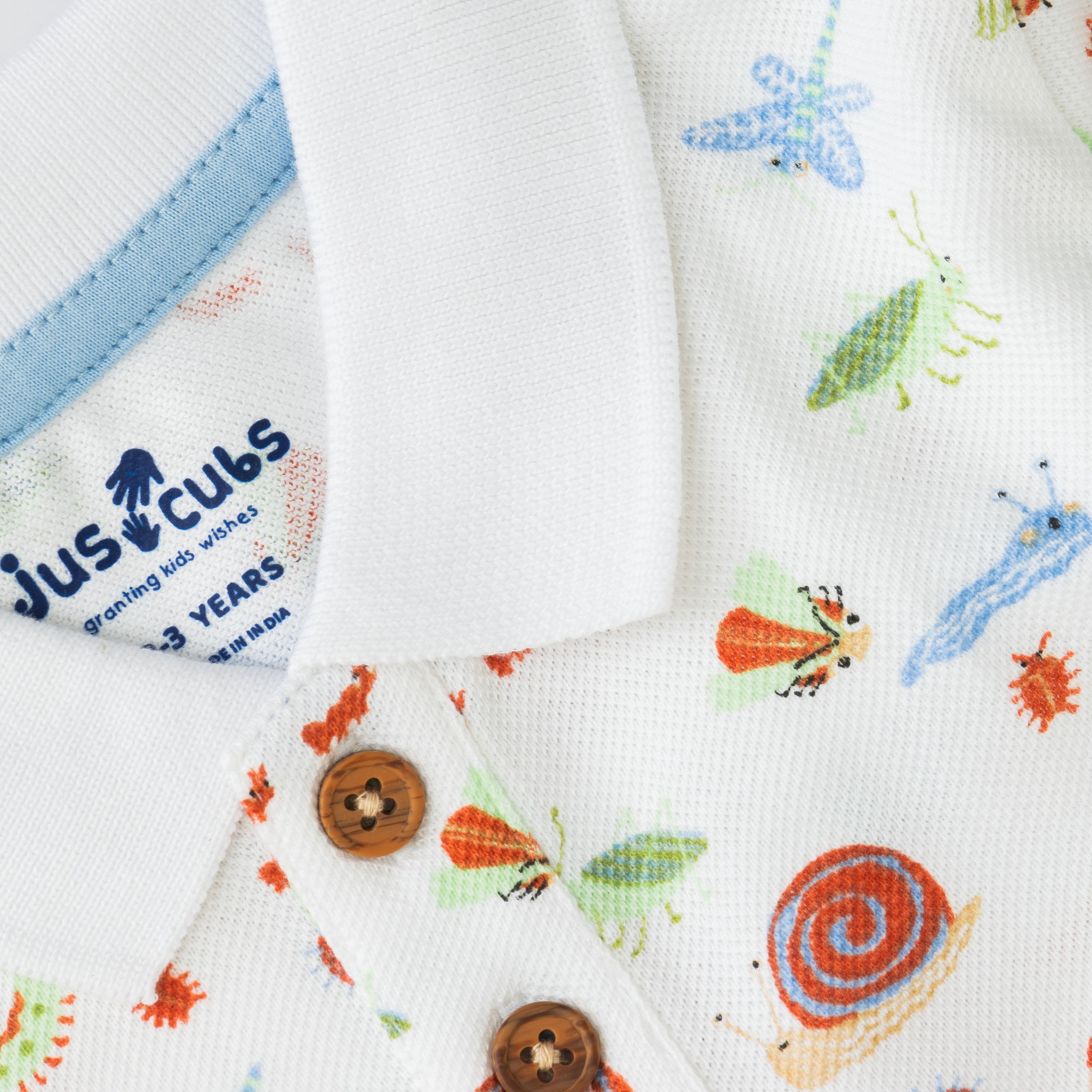 "Baby Boys White Organic Cotton Polo T-Shirt with Colorful Insect Print & Wooden Buttons"