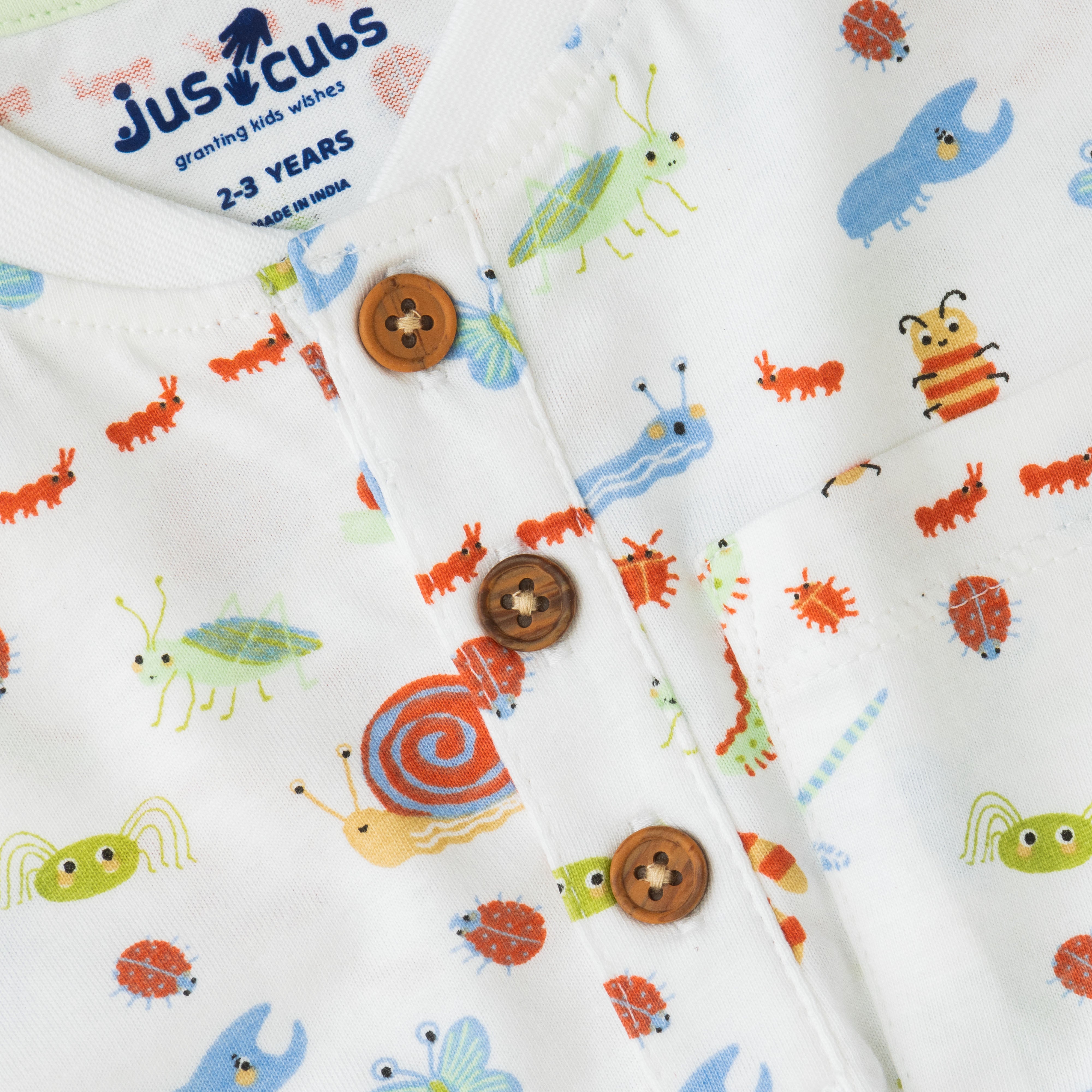 "Baby Boys White Printed Henley T-Shirt with Wooden Buttons & Pocket – 100% Organic Cotton"