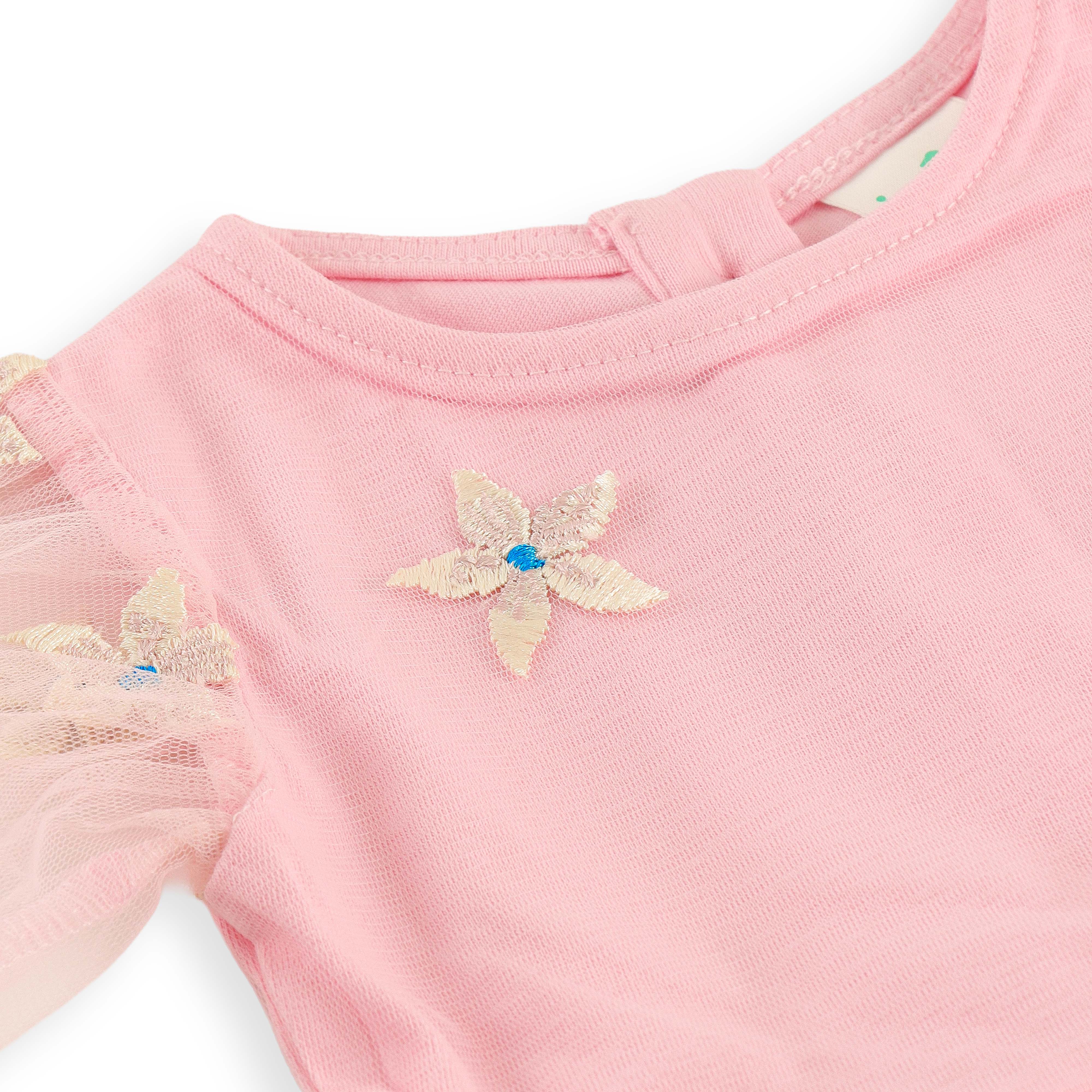 "Baby Girls Floral Embroidered Pink Tulle Dress with Short Sleeves"