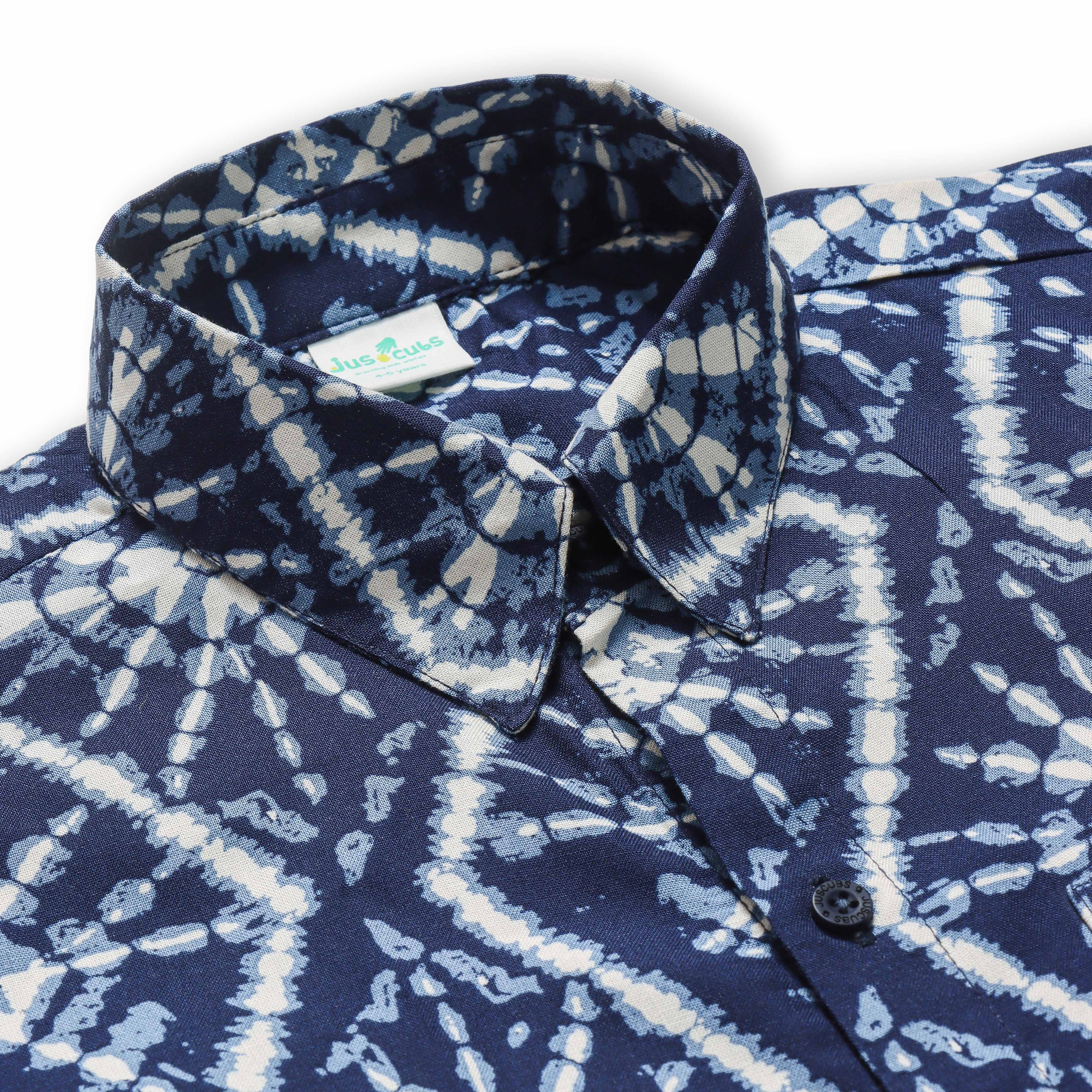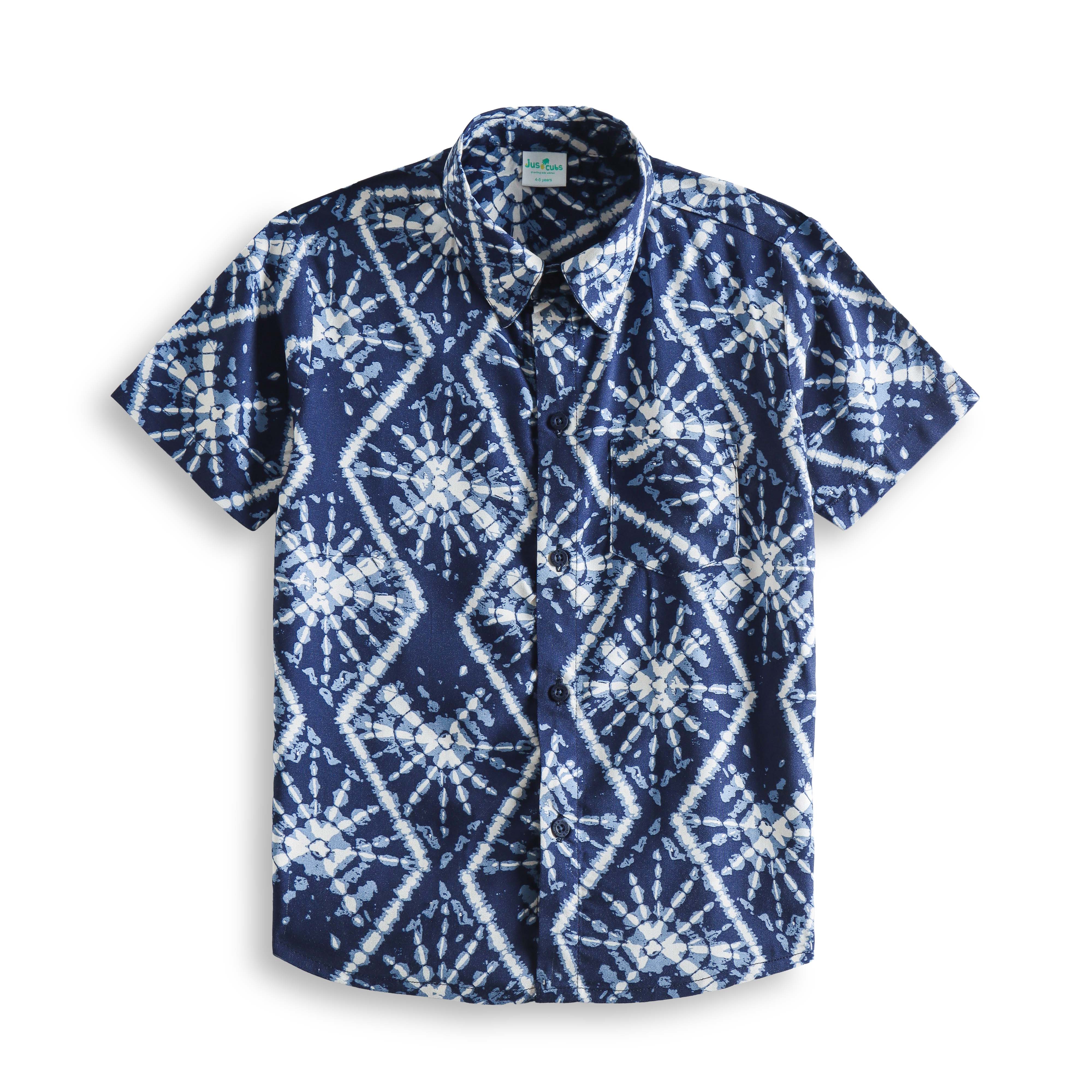 "Boys’ Navy Tie-Dye Printed Short Sleeve Button-Down Shirt – Stylish Indigo Geometric Pattern Casual Wear"