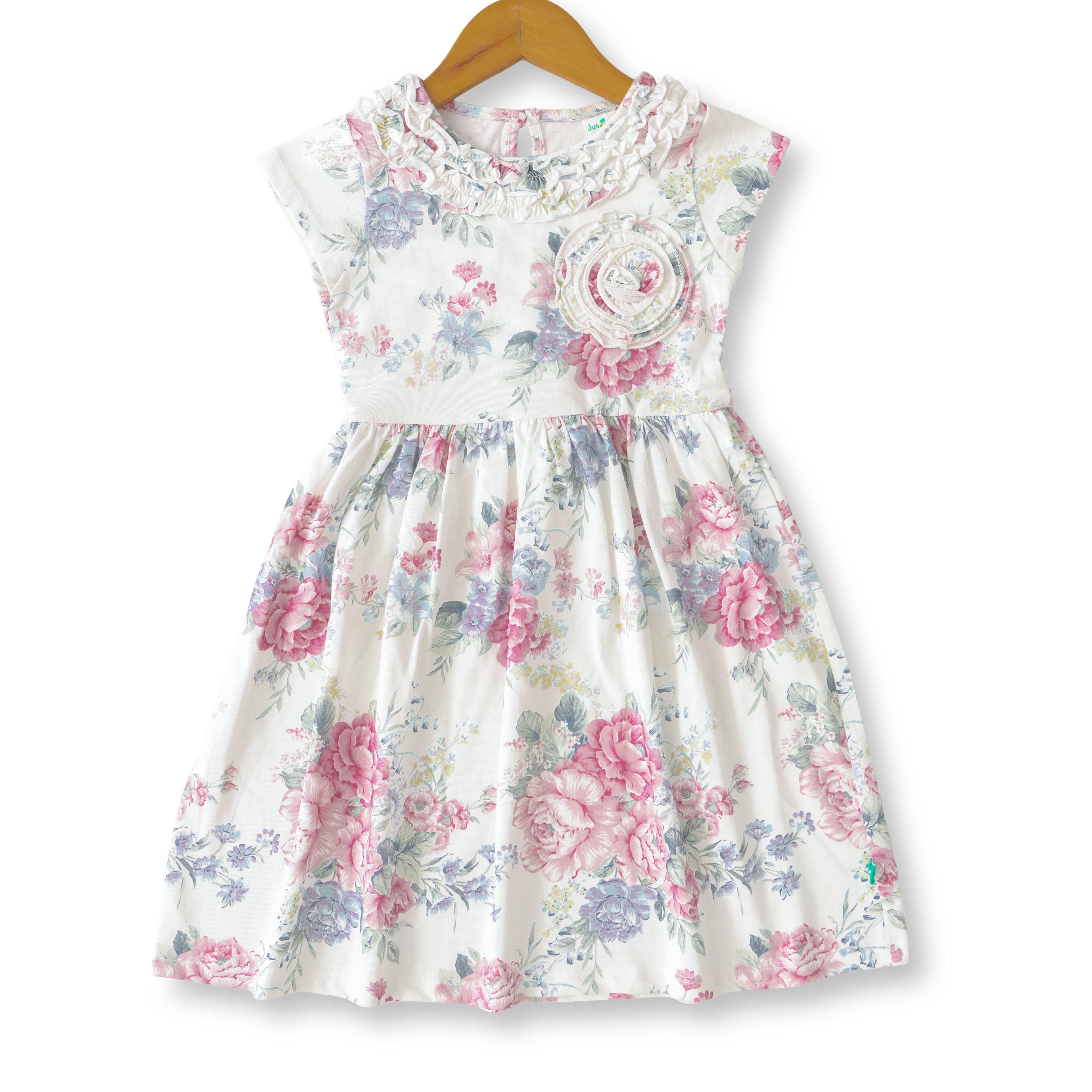 Baby Girls Soft Cotton Floral Frock with Ruffle Neck & Flower Appliqué