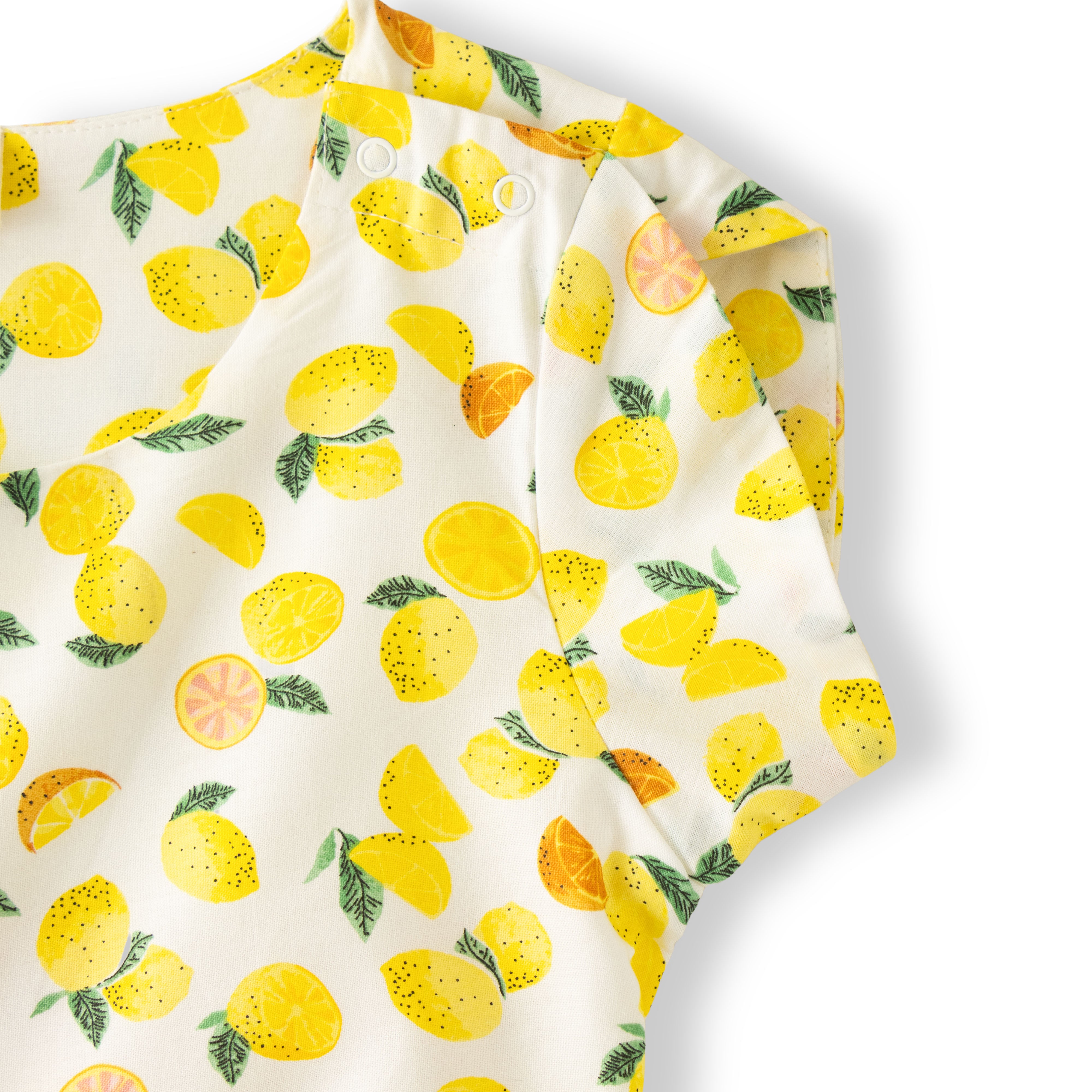“Girls Cotton Half Sleeve Jumpsuit with Allover Lemon Print – White & Yellow”